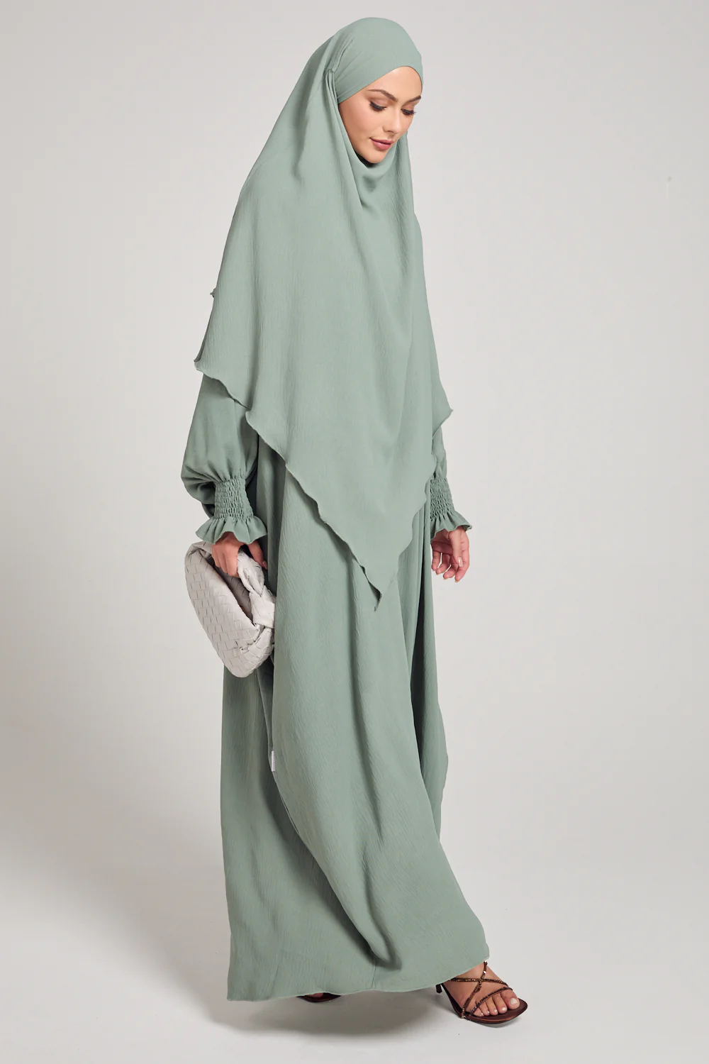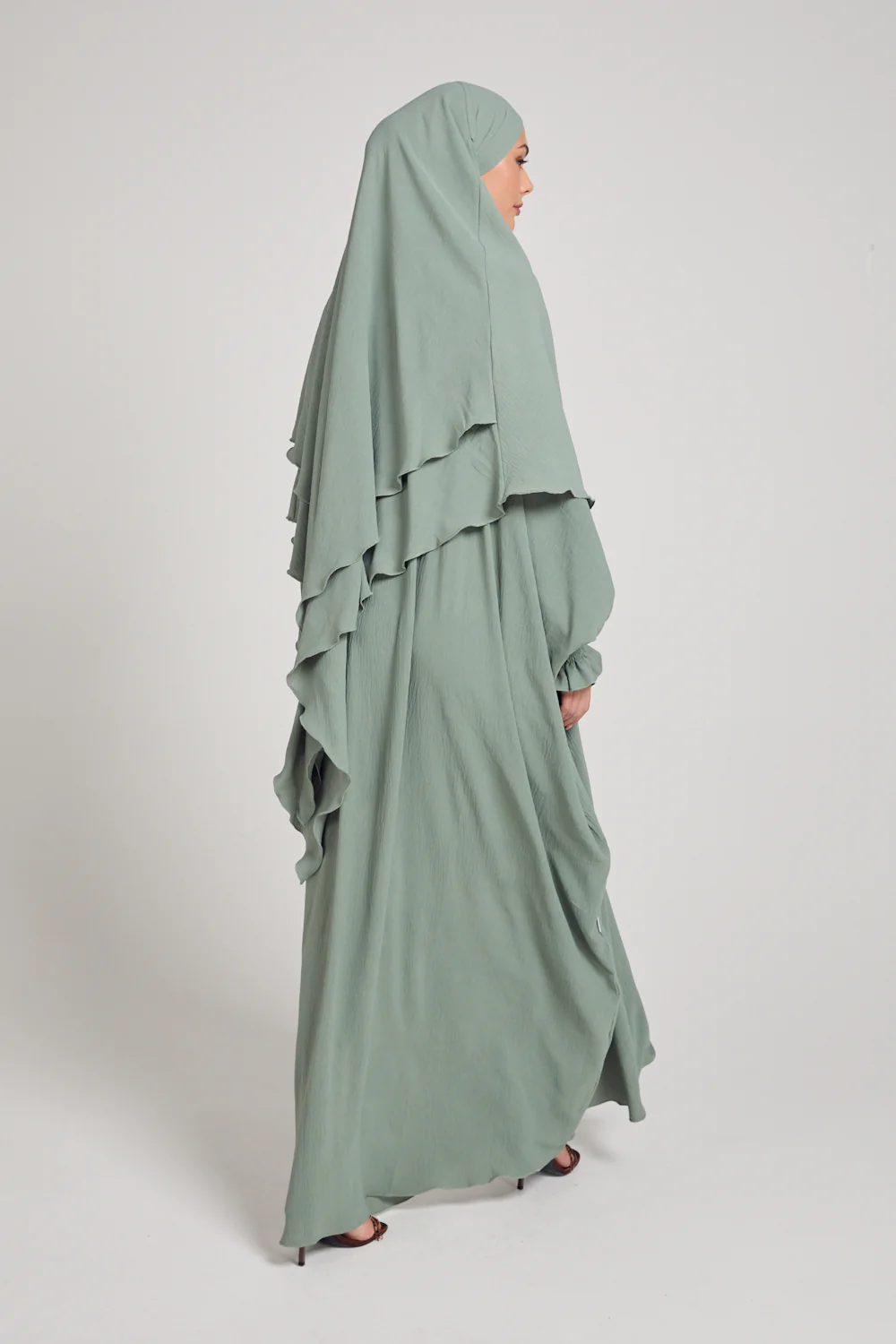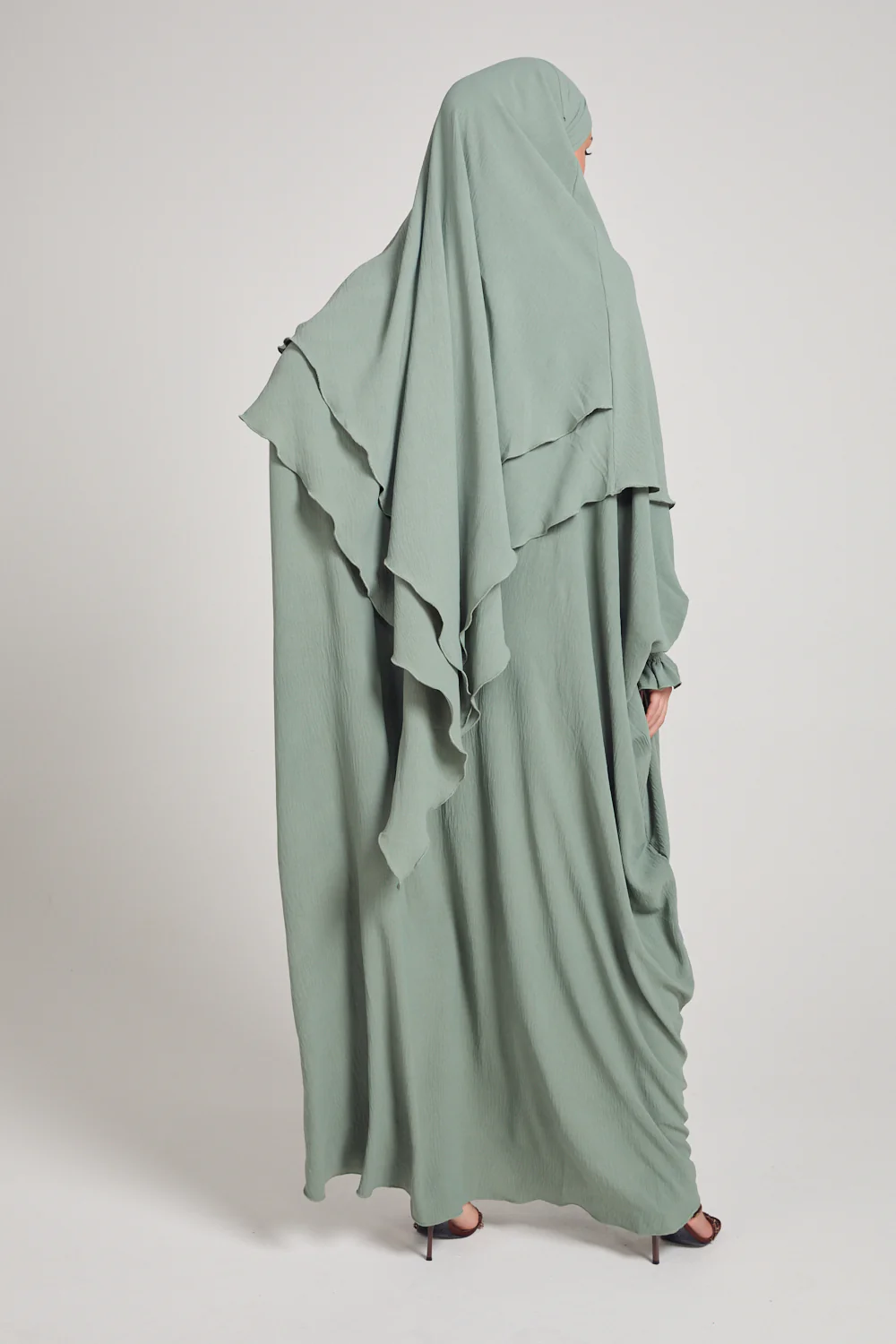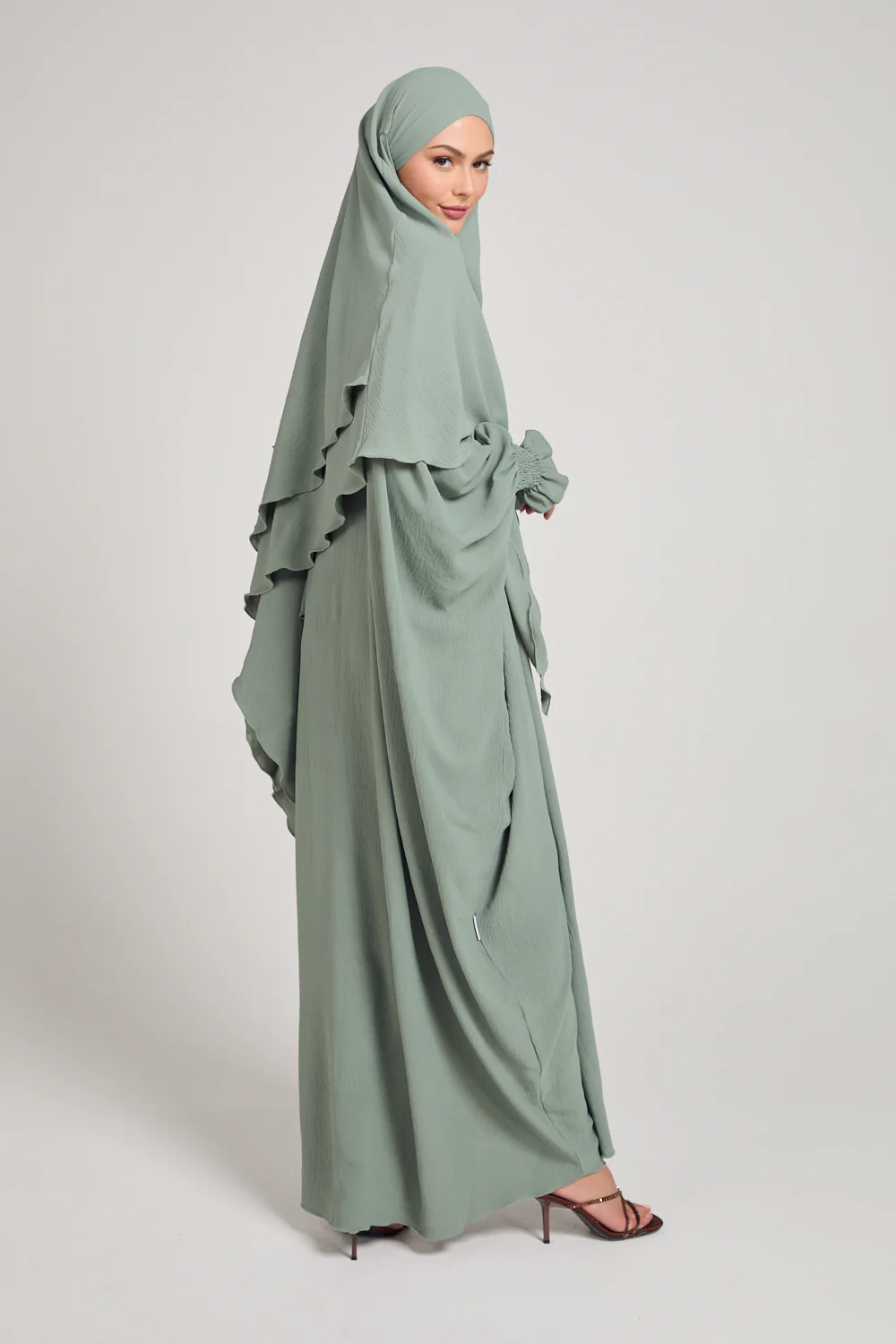 + Free ShippingCrafted from luxurious soft crush fabric, our abaya with khimar set offers all-day breathability and an airy, lightweight feel that’s easy to style. Its fuss-free matching khimar and abaya with ruffle sleeves makes it the perfect alternative to the hijab and jilbab. Refined for a sophisticated and exclusive look, this abaya set with khimar is sure to become your go-to everyday outfit.