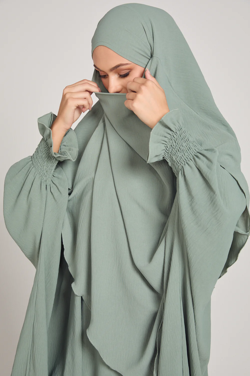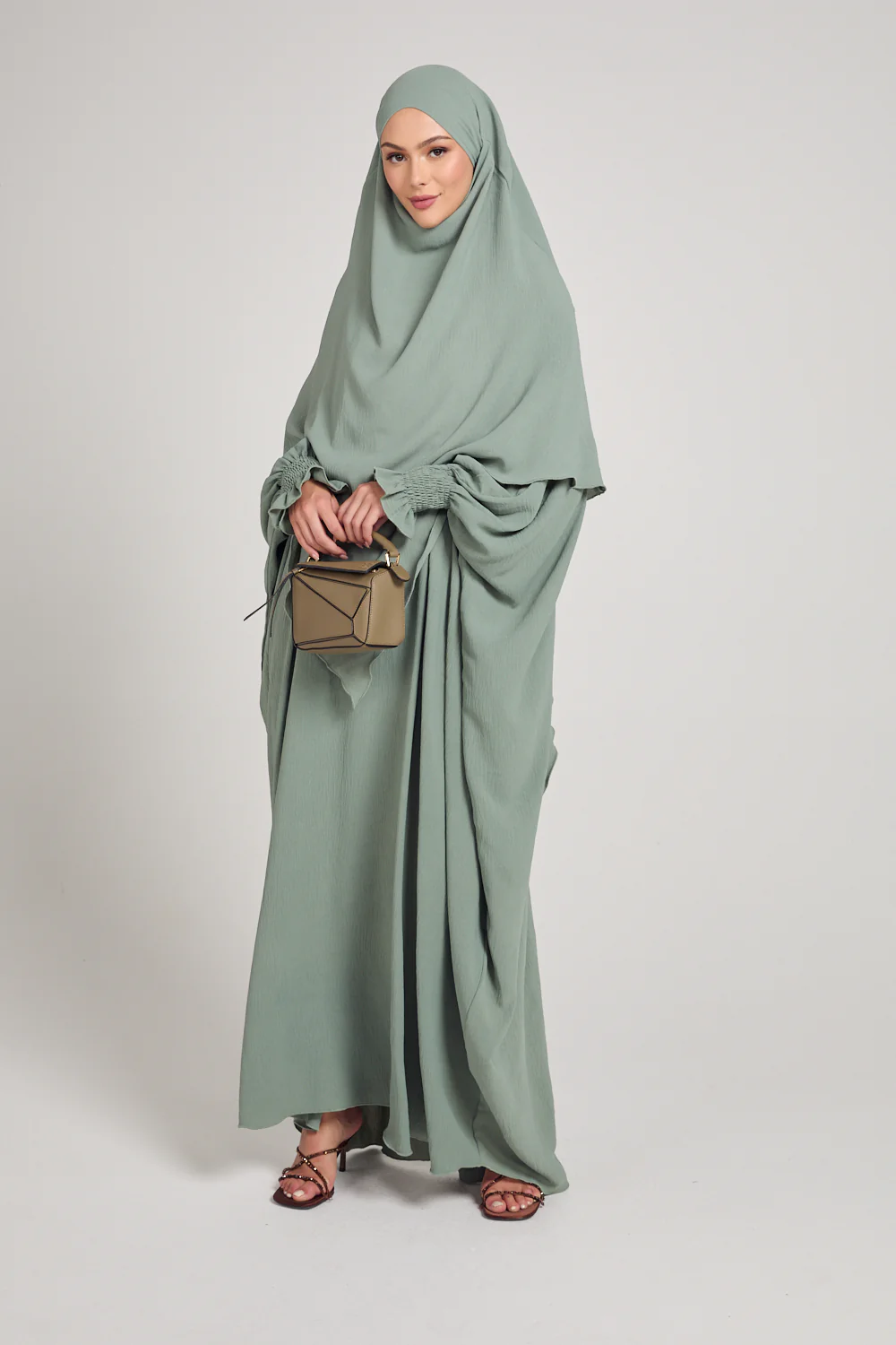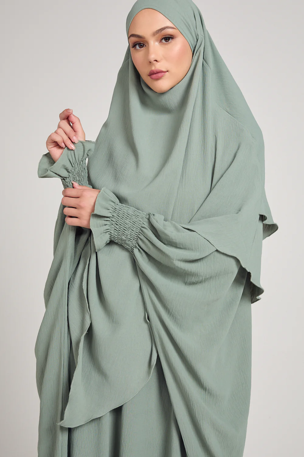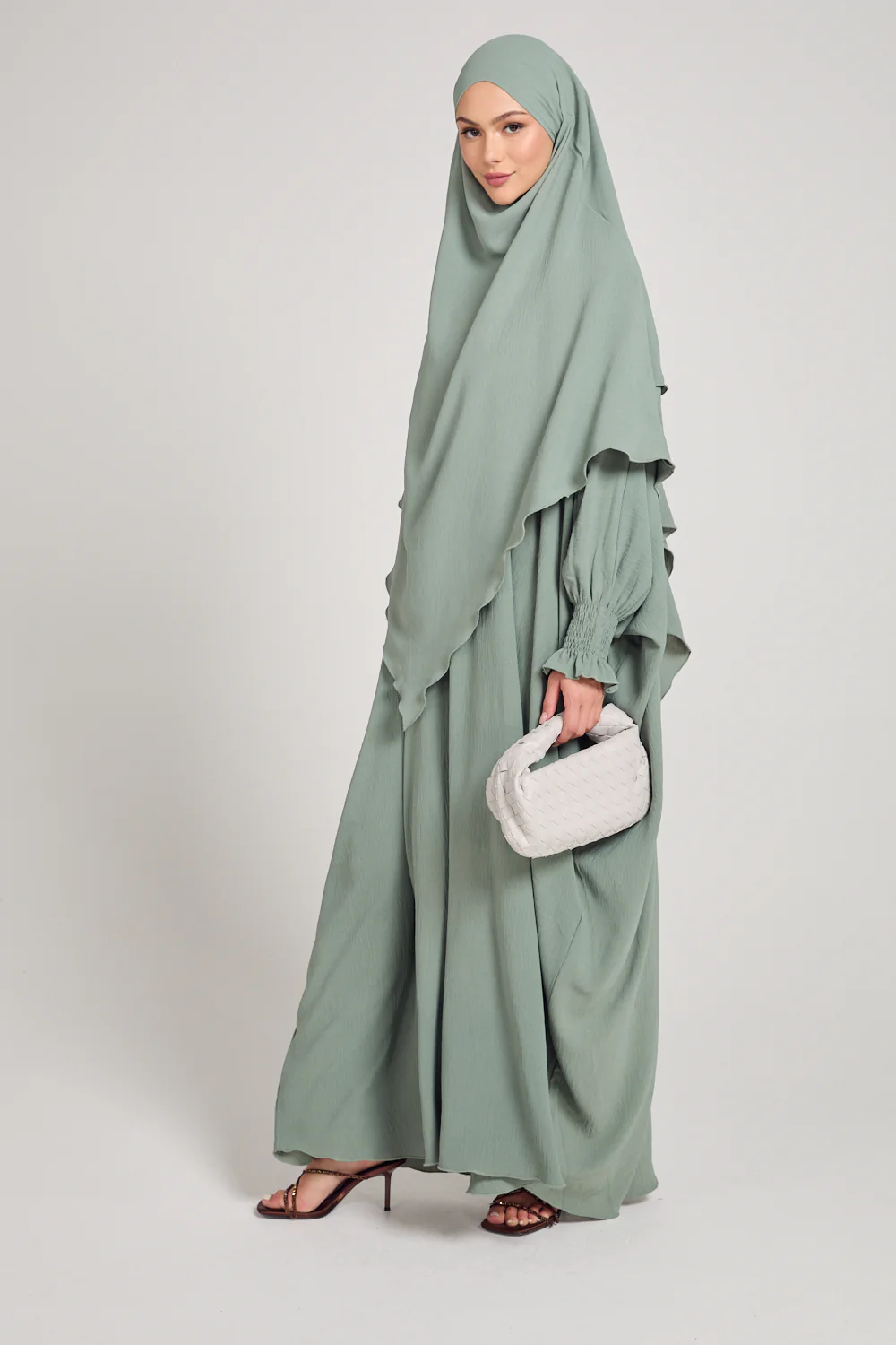 + Free ShippingCrafted from luxurious soft crush fabric, our abaya with khimar set offers all-day breathability and an airy, lightweight feel that’s easy to style. Its fuss-free matching khimar and abaya with ruffle sleeves makes it the perfect alternative to the hijab and jilbab. Refined for a sophisticated and exclusive look, this abaya set with khimar is sure to become your go-to everyday outfit.