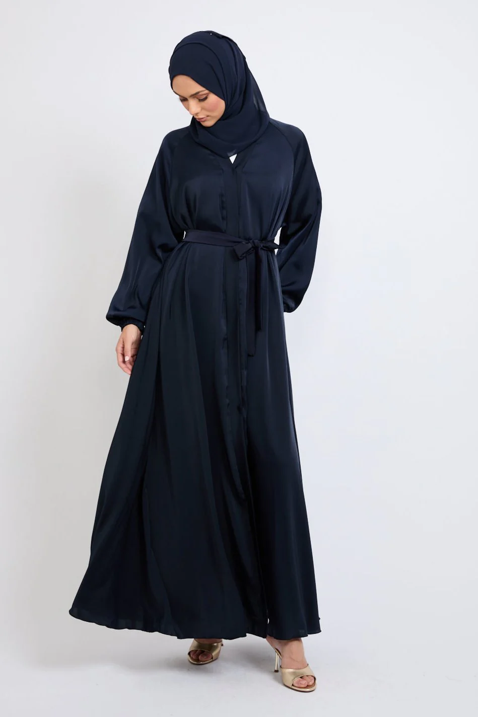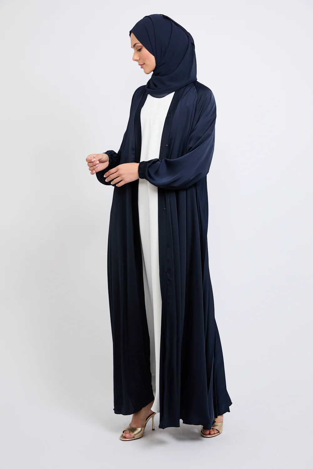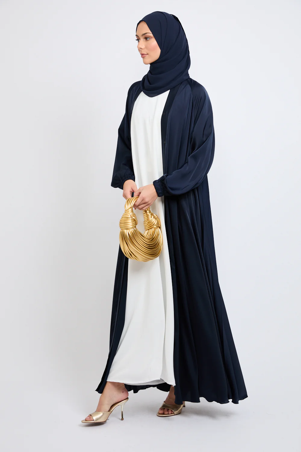 + Free ShippingDiscover the perfect balance of subtlety and elegance with our Navy Umbrella Cut Open Abaya featuring pleated back detailing. This versatile piece is a must-have for any occasion.